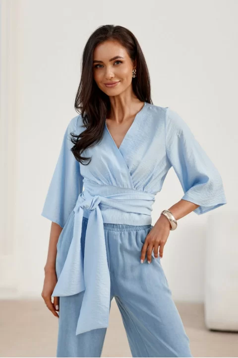 Bluzka Flavia z zakładanym, kopertowym dekoltem i skróconym krojem, wyposażona w wiązanie podkreślające talię, łączy elegancję z funkcjonalnością. Szerokie rękawy o długości 3/4 oraz miękki, delikatny materiał zapewniają komfort i idealne dopasowanie do różnych sylwetek. To ponadczasowy model, który sprawdzi się w wielu stylizacjach, łącząc wygodę z subtelnym, nowoczesnym designem.