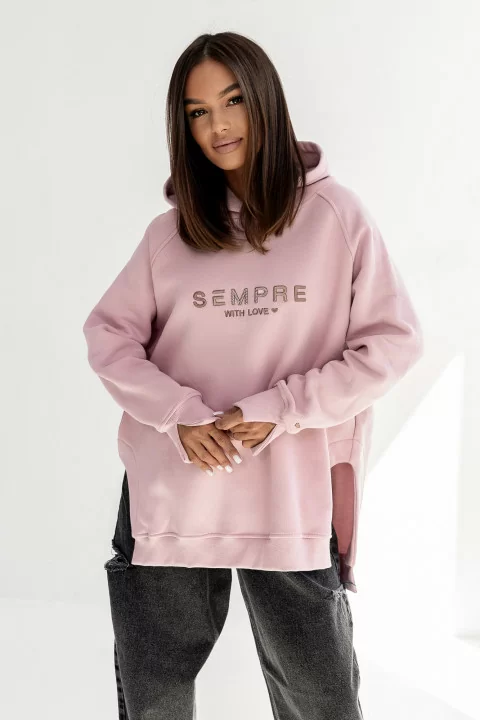Bluza damska bawełniana. Z kapturem. Na bokach delikatne zaokrąglone rozcięcia. Na przodzie haft, na rękawie wyhaftowane serduszko.
