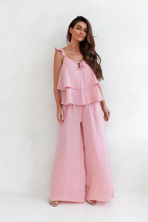 Piękny komplet bluzka ze spodniami. Bluzka na ramiączka. Ozdobne falbanki. U góry przewiązywana. Spodnie o modnym szerokim kroju.