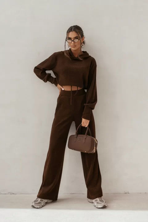 Komplet składa się z bluzki oraz spodni, które doskonale harmonizują ze sobą. Bluzka wyróżnia się prostym, ale eleganckim krojem, zapewniającym swobodę ruchów. Spodnie natomiast mają klasyczny fason, który podkreśli każde dorosłe sylwetka, czyniąc ją bardziej atrakcyjną.
