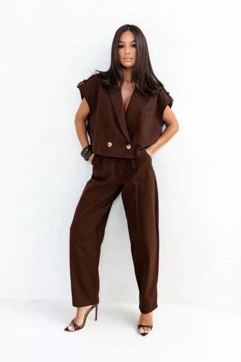 Komplet z jeansu. Kamizelka z ozdobnymi patkami. Fason oversize. Spodnie typu „baloon”. Z troczkiem w zestawie.