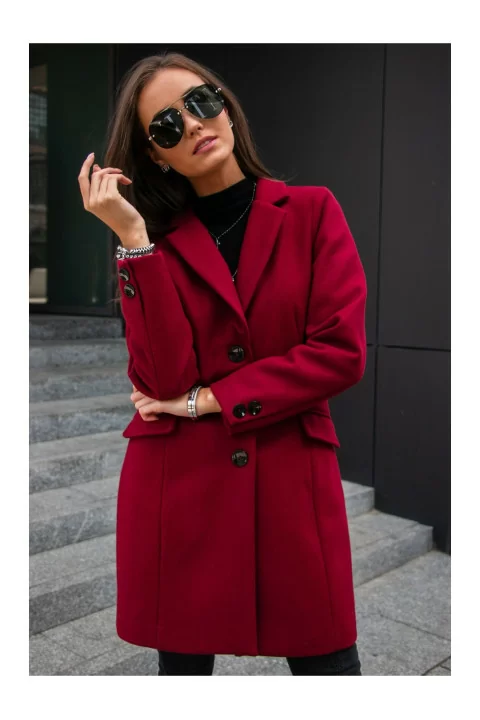 Jednorzędowy płaszcz o dopasowanym fasonie. Zapinany na trzy guziki z klasycznym kołnierzem. Posiada podszewkę, praktyczne kieszenie i zdobienia w postaci guzików na rękawach. Polska produkcja. Modelka ma 174 cm wzrostu i nosi rozmiar 36.