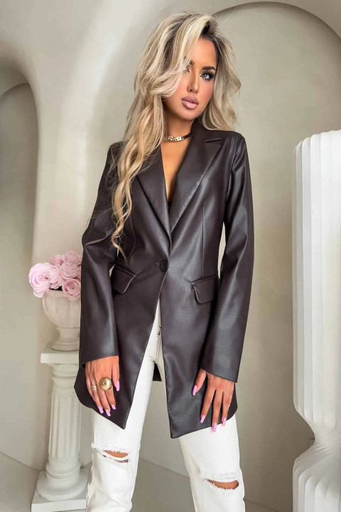 Marynarka o klasycznym, eleganckim fasonie. Jest delikatnie dopasowana w talii, dzięki czemu subtelnie podkreśla sylwetkę. Posiada jednorzędowe zapięcie na jeden guzik oraz klasyczne klapy o średniej szerokości. Po bokach znajdują się dwie kieszenie z patkami. Długość marynarki sięga poniżej bioder, co zapewnia eleganckie proporcje. Długie rękawy mają prosty krój.