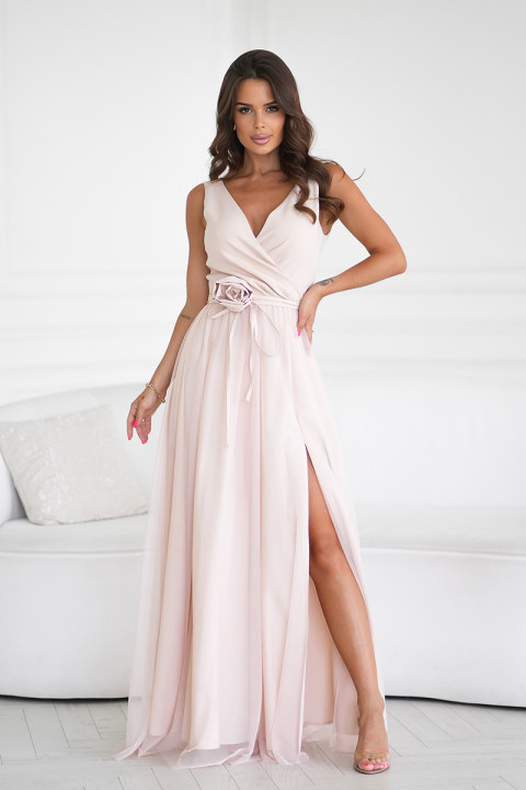 Góra sukienki z kopertowym dekoltem subtelnie podkreśla biust i szyję, natomiast pasek z ozdobną różyczką dodaje elegancji, który można owinąć na wiele sposobów – zarówno na szyję, jak i na talię, co pozwala na indywidualne dopasowanie stylizacji.Rozcięcie na nodze wprowadza nutę zmysłowości i lekkości, idealną na wieczorne przyjęcia.