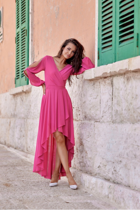 Asymetryczna suknia w maxi długości. Rozkloszowany dół z rozcięciem, góra z przekładanym dekoltem oraz niesamowite długie bufiaste rękawy z ozdobnymi rozcięciami. Rękawy zakończone elastyczną gumką.