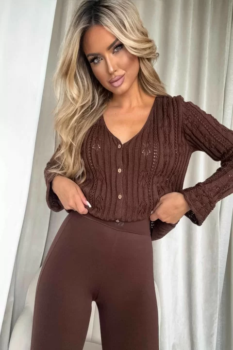 Ażurowy sweter z długim rękawem i dekoltem w serek. Wykonany jest z dzianiny o widocznym, strukturalnym splocie z delikatnymi ażurami, które nadają mu lekkości i kobiecego charakteru. Sweter zapinany jest na małe, drewniane guziki. Luźny krój oraz miękki materiał zapewniają komfort noszenia, a głęboki dekolt dodaje całości subtelnej zmysłowości. To doskonały element garderoby na wiosnę lub chłodniejsze letnie wieczory.
